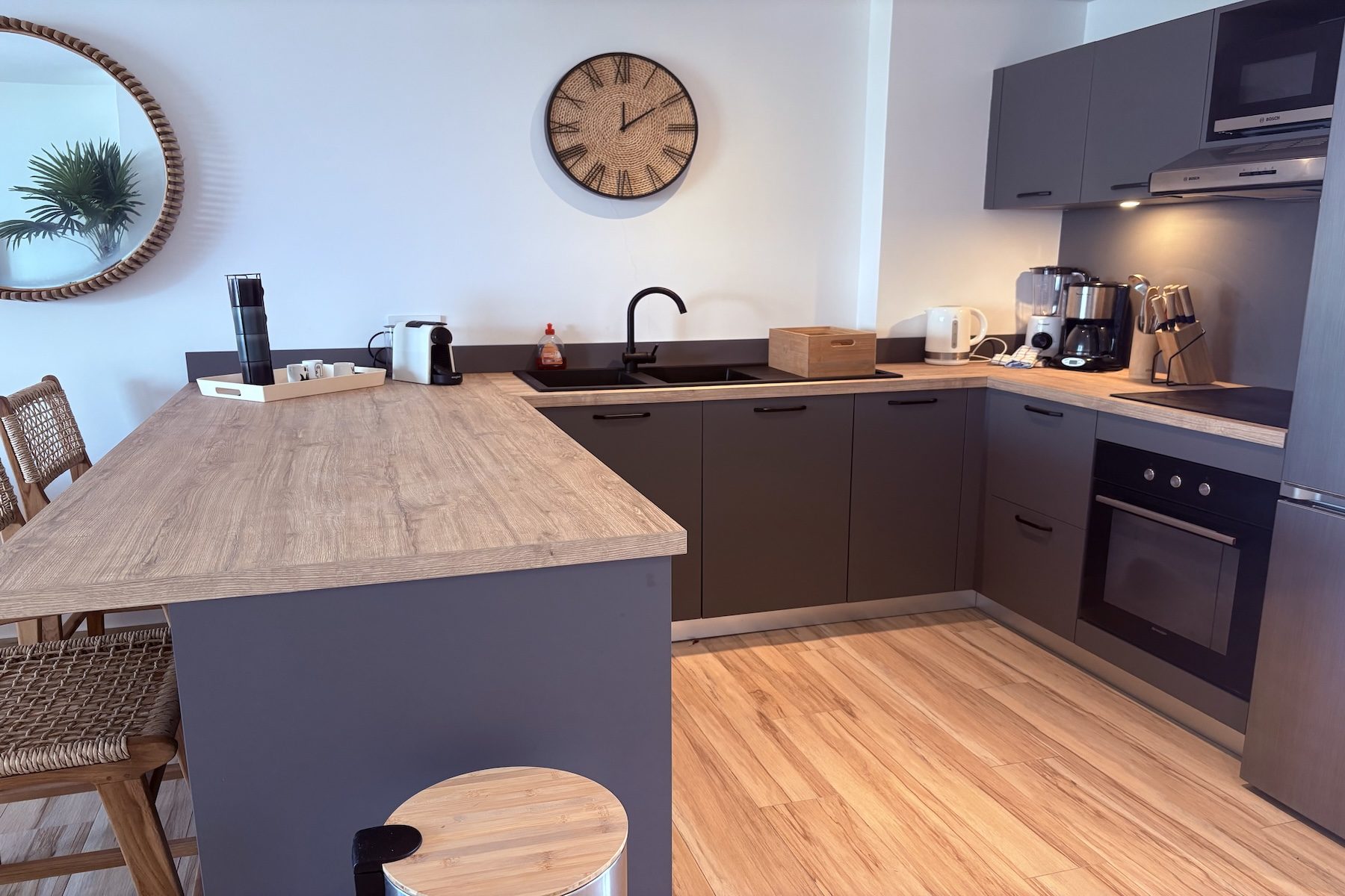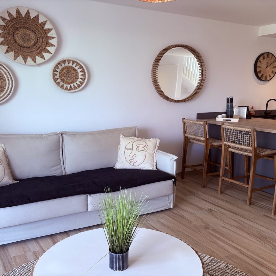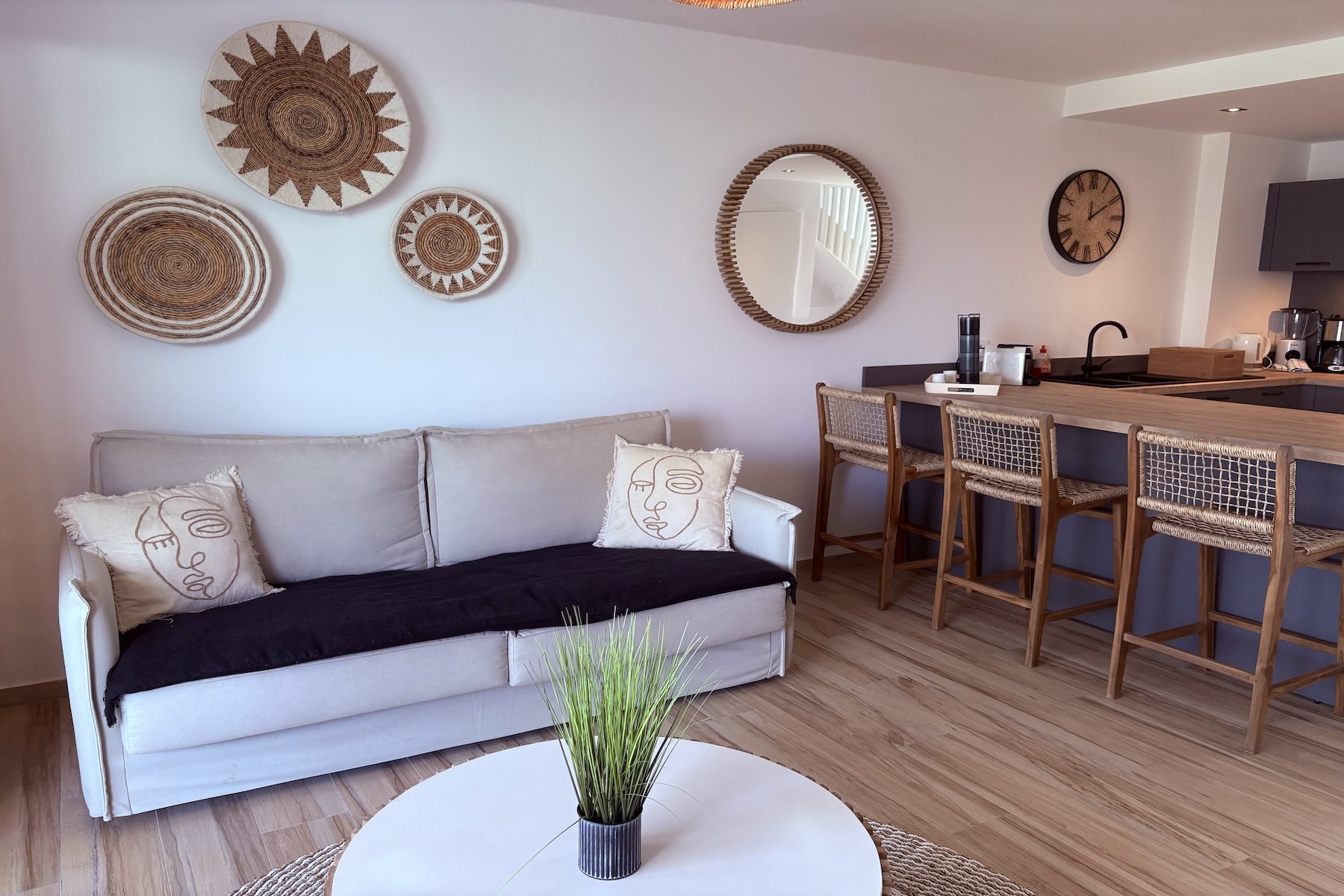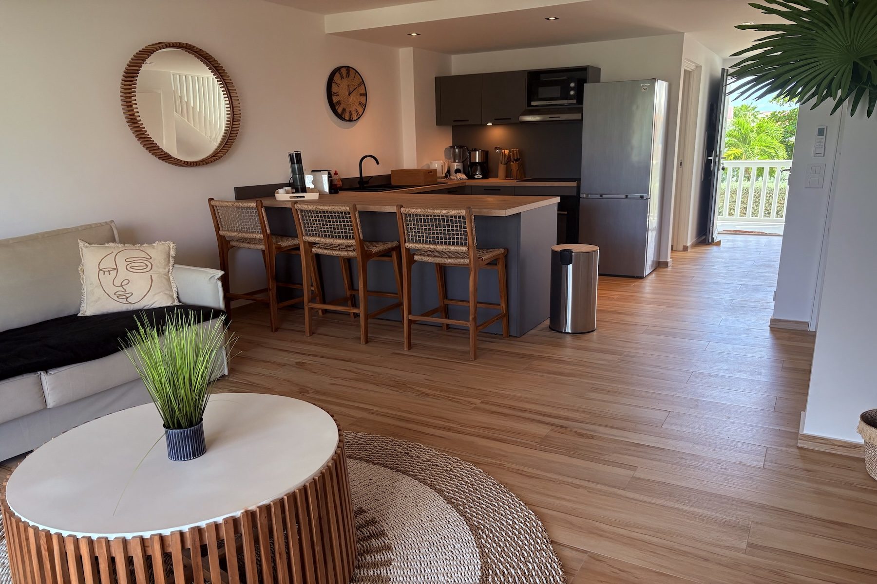 The duplex opens onto a fully equipped kitchen and a beautifully appointed living room, providing an ideal space to gather and relax. Enjoy the trade winds by having your meals on the terrace while contemplating the sea.