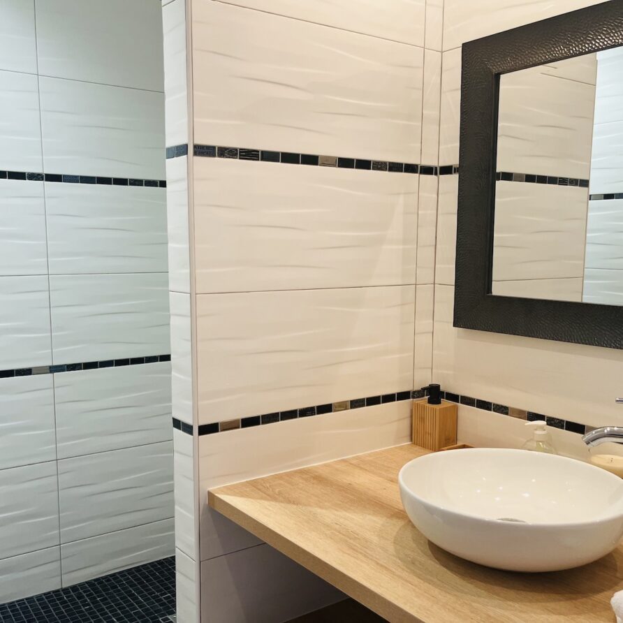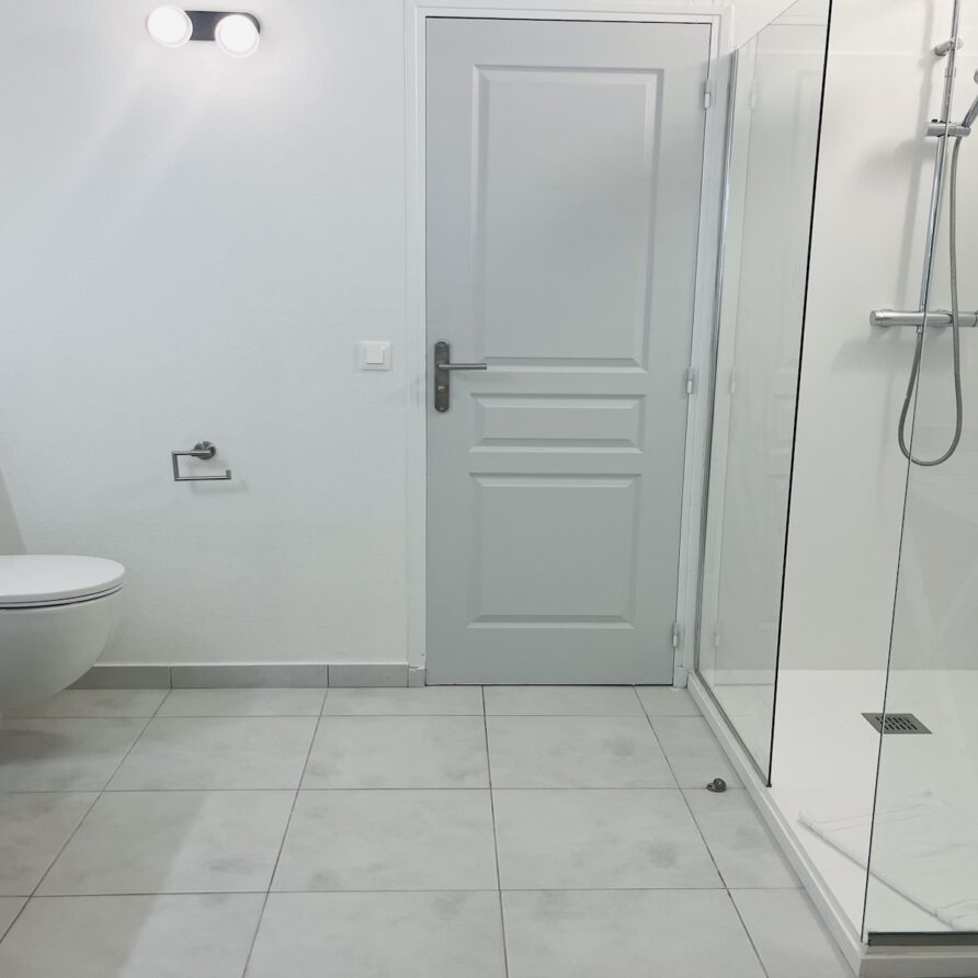 On the man level: fully equipped modern kitchen, welcoming living area, opening on a nice terrace with view to the beach, 1 bedroom with ensuite bathroom and toilet.
