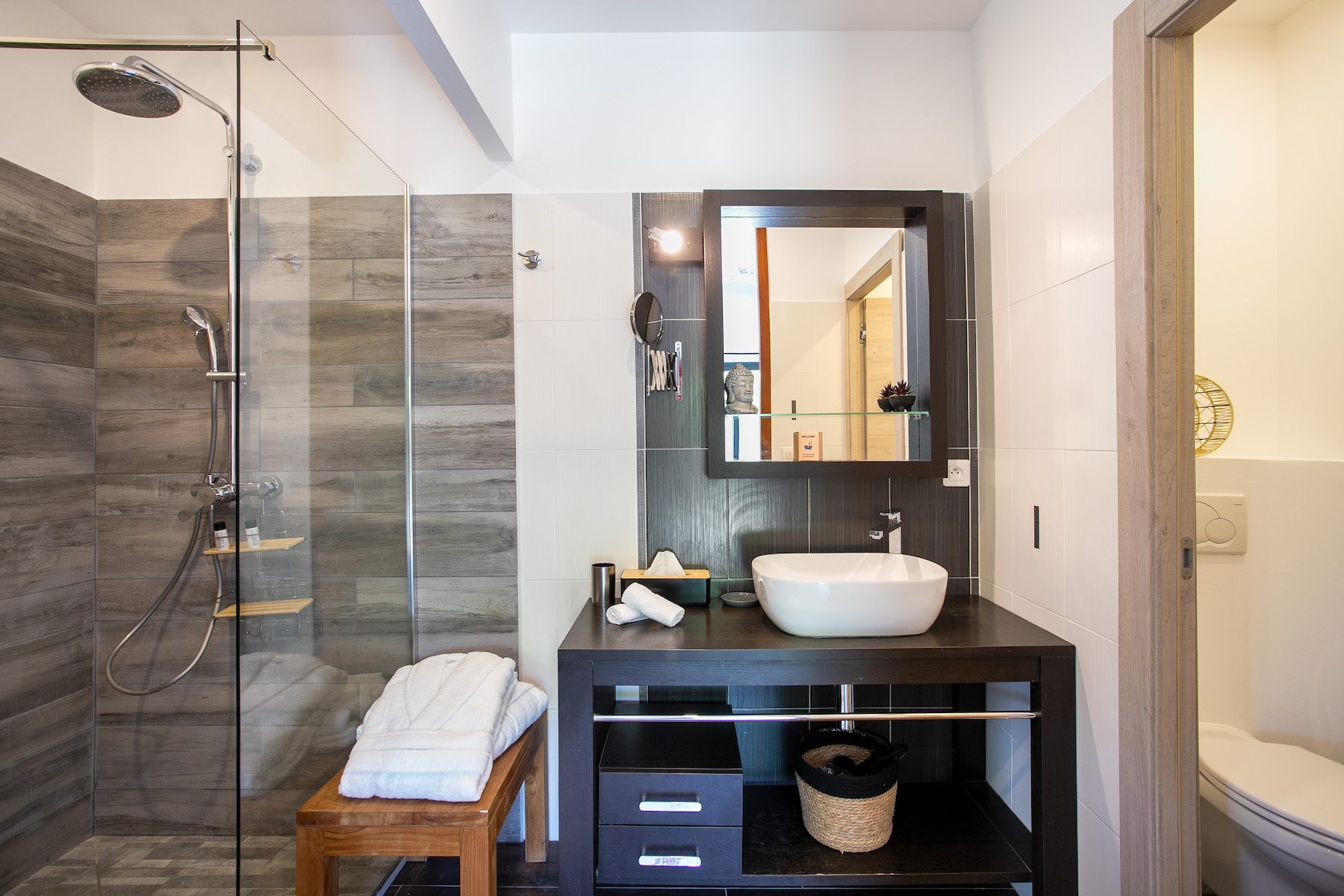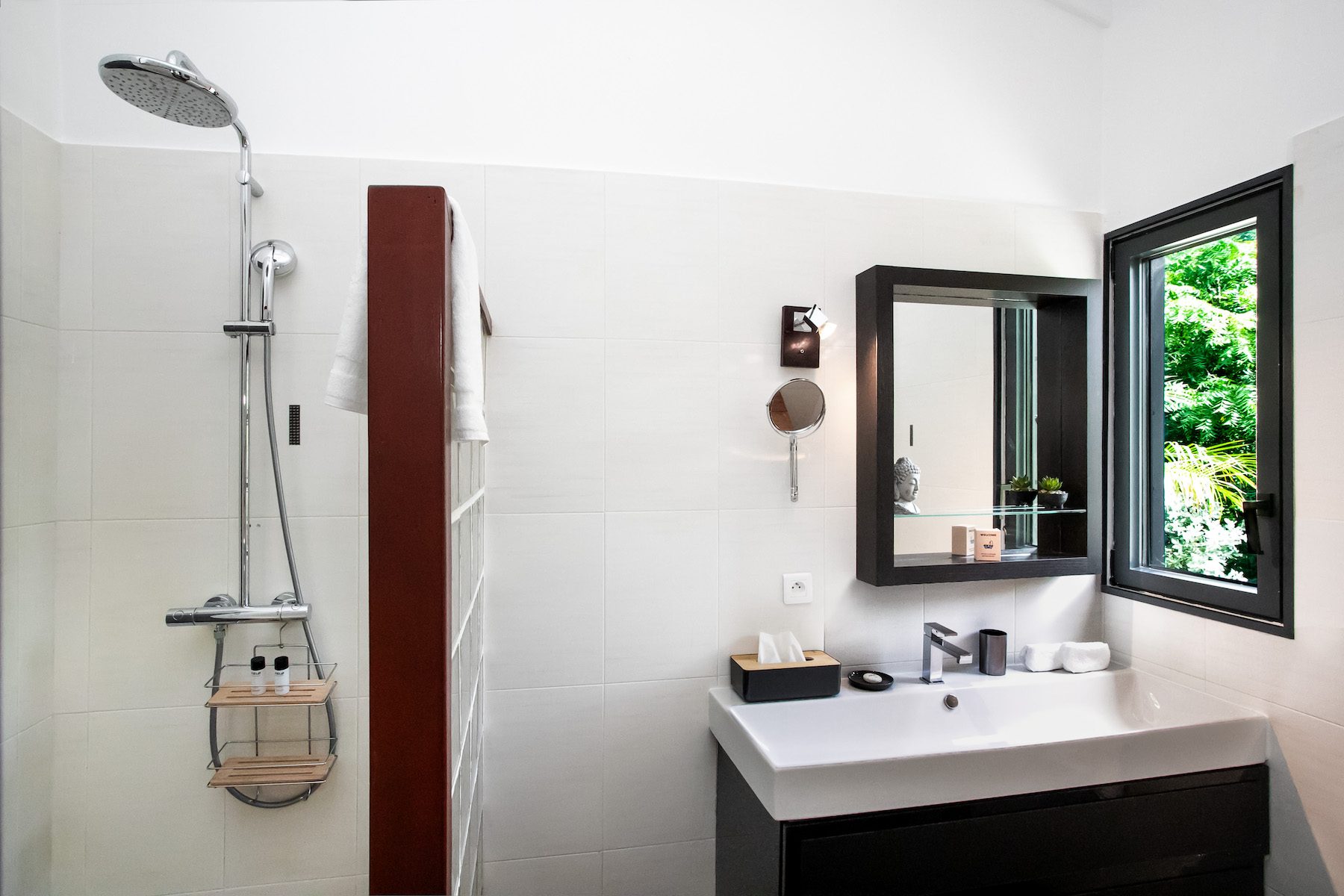 The living room is both modern and exotic in style and bathed in light thanks to large slidding doors which provide panoramic views of the swimming pool, the sea, the mountain or the garden. It is composed of a perfectly equipped kitchen (dishwasher, complete small appliances, oven, induction and gas hobs, etc.), a large convivial table for indoor meals and a cozy and comfortable living room in front of the connected tv. The villa is fully air-conditioned and equipped with fiber optic wifi.